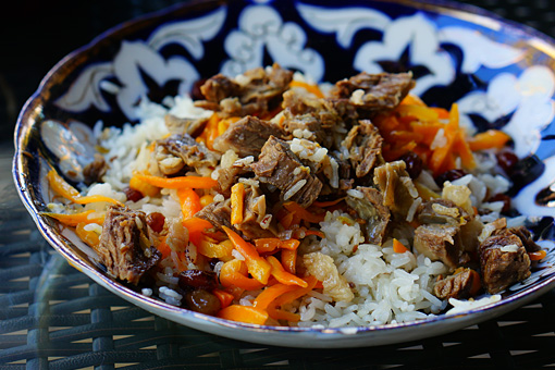 青の模様の美しいウズベキスタンのお皿で出されたプロフは、