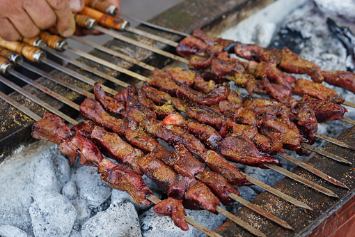 豪快に切り出された串焼き肉は見た目にも食欲をそそる。
