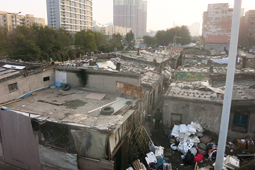 ウイグル人のものと思われるバラック小屋がひしめく対比は強烈なものがあります。