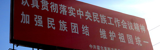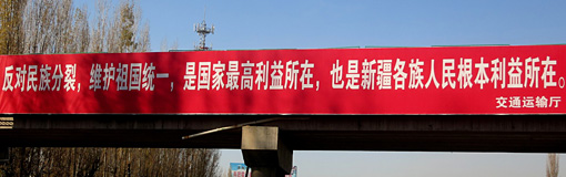 自治区の高速道路沿いにはこれでもかというぐらい「国家統一」「民族団結」