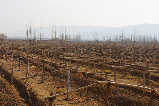 辺りと同じく土気色がむき出しになったぶどう棚だけは、