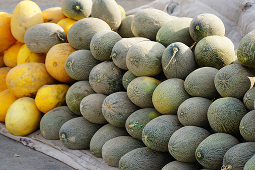 ハミ瓜を売る露店が道路沿いに連なっています。