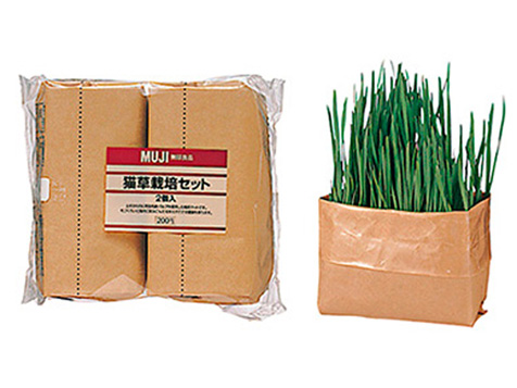 土のかわりに再生粉砕パルプを使用した「猫草栽培セット」で、
