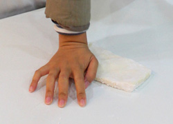 そして、しっかり手でこねあげたら、それを袋に入れて足踏み。
