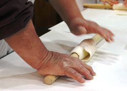 麺棒を生地に巻きつけながら前方に押し出すように延ばし、