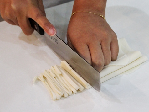 こうして均等に延ばした生地を重ね、3~5mm間隔で切っていきます。