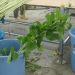 収穫したばかりのひまわりは、新鮮そうな葉がたくさん。