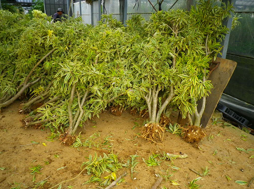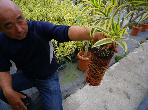 立派に成長したら地面から掘りおこし、流通させるためにプラスチックの鉢に入れていきます。折角成長した根ですが、鉢に収まるように切断をします。大きな樹の場合は電ノコなどを使って、切り落としていきます。
