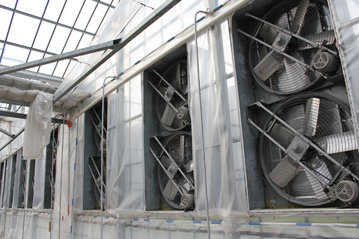 ハウスのひとつの壁面に大きな換気扇がついていて、離れた向かいには、