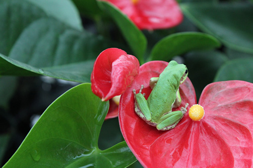 ハウスの外にあったアンスリウムに、緑が鮮やかなアマガエルがちょこんとのっていました。