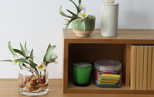 透明のフラワーベースや食器に入れて、球根も一緒にお楽しみください。