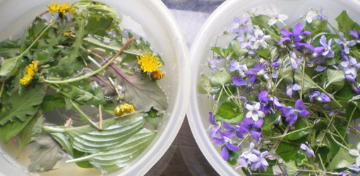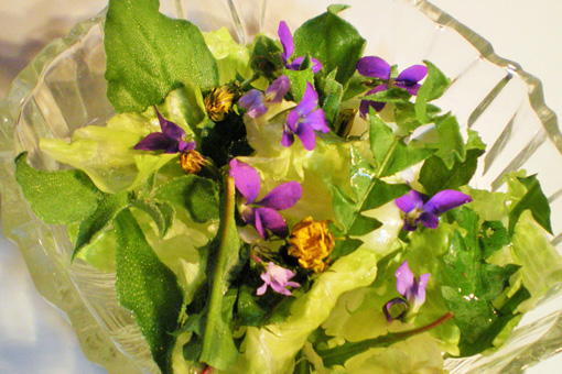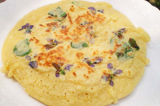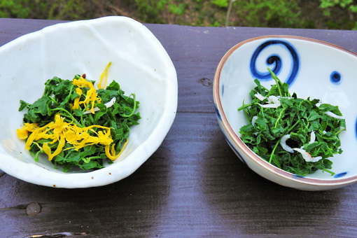 そしてこちらは、タンポポ、レタスと合わせて胡麻油と塩だけで味付けした「春色サラダ」。時間に余裕があるときは、おやつのホットケーキにも散りばめて遊びます。