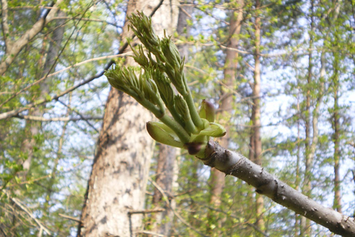 陽射しがまぶしくなってくると、タラの芽の出番です。天に向かってすっくと伸びた幹はトゲにおおわれていて、その先端にふっくらと愛嬌のある芽をつけます。もっちりした食感は天ぷらにすると最高。でも、ちょっと油断していると育ち過ぎて葉っぱが開いてしまうので、東京と森を行ったり来たりする私は、タイミングを逃すことも。先端の一番芽のあと、二番芽、三番芽と脇芽を付けていきますが、翌年も翌々年も楽しむためには、二番芽、三番芽は採らずに残しておくことと教わりました。脇芽を採りつくすと、樹勢が衰えて枯れてしまうのだそうです。