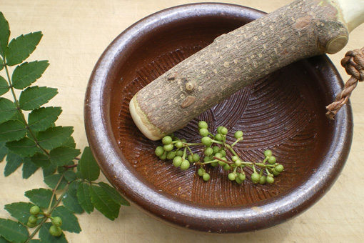 青葉は薬味に、実はちりめん山椒にと、ずっと楽しめる山椒。そして、材の固さを活かしてスリコギになるのも、山椒の木です。ちなみに写真のスリコギは、わが家の山椒の木で作ったもの。台風のとき近くの木が倒れかかって真っ二つに割れてしまったため、スリコギとして再生させました。