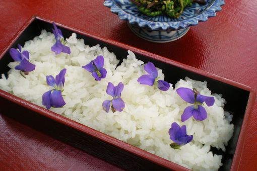 可憐な姿と鮮やかな色で、食卓を春の色に染めてくれるのは、すみれです。「すみれごはん」は、薄い塩味で炊き上げたごはんに洗って水気を切っておいたすみれを合わせるだけ、という簡単ごはん。アツアツのごはんにのせても、ごはんが冷めてもきれいなすみれ色を保って、春の野を感じさせてくれます。