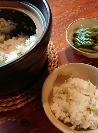 乾燥大豆は自家製ではありませんが、豆ごはんもわが家の定番。前夜お米と一緒に青大豆を入れて仕かけておけば、翌朝は普通に炊きあがっていて、こちらは「炊きながら戻し」です。