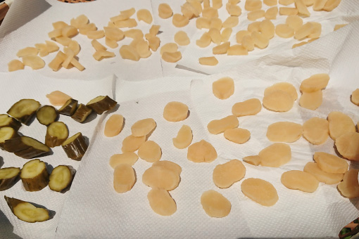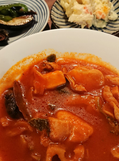 コトコト煮込むシチューも、野菜を切るところから始めるとなると、ウィークデーの夜のメニューとしてはややハードルが高いもの。でも、チキンを炒めたお鍋に干し野菜を放り込んで、トマトジュースで30分煮込むだけなら、気軽に出来てしまいます。ちなみに写真のトマトシチューには、レンコン、セロリ、ブロッコリー、カブ、ブラウンマッシュルーム、シメジ、エノキ、エリンギ、マイタケ、長芋、ニンジン、パプリカ、トマトなどが入っていますが、チキン以外は全部乾物。思い立ったらすぐにできるのも、乾物なればこその技です。奥のポテトサラダも、中のきゅうりは2~3時間くらい干ししたもの。歯ざわりがよく、サラダが水っぽくならないので、おススメです。