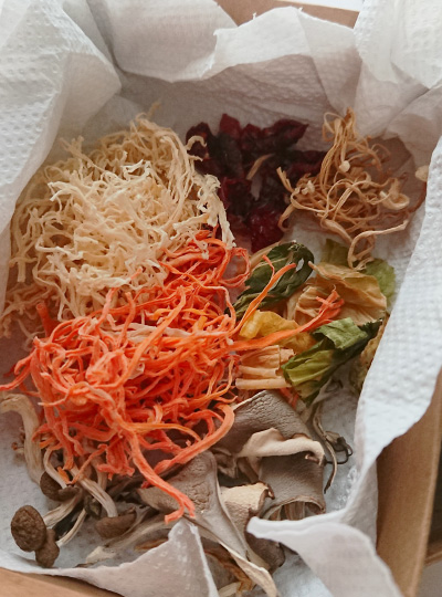 こうして遊び半分でやっているうちに気づいたことは、「乾物は究極のインスタント食品」だということ。とはいえ、料理の前段階でお天道様を味方につけて下準備をしているわけですから、単なる手抜きとは違います。旨みが凝縮した味わいや、生とは違った歯ごたえなど、乾物ならではのおいしさも。そして、乾物にして食材を食べつくすことでフードロスも減らせるとしたら…もっと活用しなければもったいないと思いませんか?