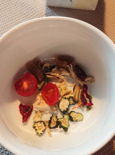 二拠点居住というとよそ目には優雅に見えるようですが、移動に時間を取られる分だけ忙しく、現実はバタバタとした暮らしです。特に東京に行っている間は、ミーティングや取材などで出かけることが多く、ゆっくり料理をする余裕はありません。かといって外食ばかりでは飽きてしまいますし、不健康。というわけで、小さな紙の箱に入れた自家製乾物を持って東京へ。軽いし、何より、まな板や包丁いらずという簡便さがうれしいからです。基本のスープは、乾物野菜と鶏ガラスープや白だしなどをカップに入れてお湯を注ぎ、塩コショウ少々を足して出来上がり。お野菜たっぷりの自家製インスタントスープが、東京での食生活を支えてくれています。