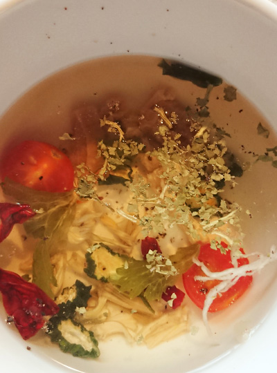 白だしや鶏ガラスープとお湯を注いで、出来上がり。ごま油やオリーブオイルを加えてバリエーションを楽しみます。