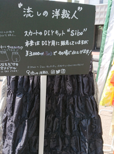 会場で最初に目に飛び込んできたのは、「流しの洋裁人」と大きく書かれたボード。テーブルの上には、ミシンが鎮座しています。