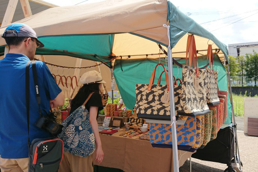 その一方で、縮小化していく繊維産業をハタオリマチと名付けてとらえ直し、街が活気づく楽しい仕組みをつくっていこうという動きも。そんな活動の中から生まれた秋のお祭りが、機織りの町を体感できるイベント「ハタオリマチフェスティバル」です。そのプレイベントとして「SUMMER PARTYハタオリマチの夏祭り」があると聞いて、昼の部のマーケットを覗いてみました。