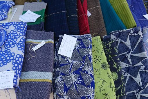 聞けば、ミシンや裁縫箱、生地を持参して全国各地に赴き、そこで出会った人々のためにその場で採寸し、セミオーダー形式で服を制作しているのだとか。服に使用する生地は、訪れた土地の機屋さんから直接仕入れたもので、その日に並んでいた生地は、ここ富士吉田の機屋さんで織られたものでした。