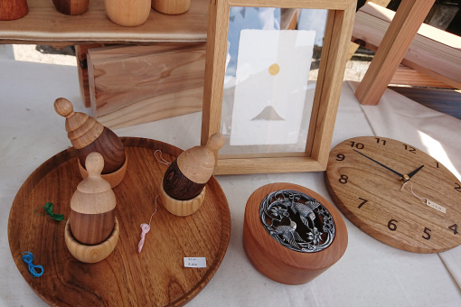 県内、身延町から来ていた木工作家、遠藤貴也(たかなり)さんは、同町の廃校(旧大須成小学校)の再生プロジェクトにも参加している人。作家の人となりと木の温もりが相まった、心安らぐ作品が並んでいます。どんぐりの形をしているのは子ども用のガラガラで、裏面に名前や生年月日、出生時の体重などを刻印してくれるとか。その他、オーダーメイドにも対応してくれるそうです。