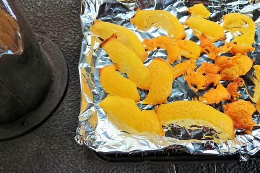 自家製の乾物も、冬はもっぱら薪ストーブの上で。たとえ晴れた日でも外に出すと凍ってしまうので、薪ストーブの上に焼き網やホイルを敷いて水分を抜きます。干しりんごなどのドライフルーツにするなら、天日干しよりも効率的かもしれません。柚子などの皮は、干したものをミルで挽いて粉末にし、お塩やお砂糖と合わせて柚子ソルトや柚子シュガーに。爽やかな柑橘の香りを楽しみます。