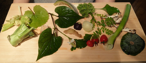 ある日のベジブロス材料。ネギやスイカの皮に交じって、山椒やドクダミ、ユキノシタなどが入りました。