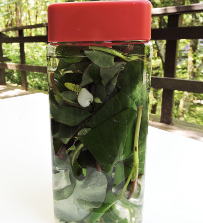 化粧水もつくれると聞いたので、花の時期の生葉をウオッカに漬けてみました。半年から1年程度寝かせたものは、日焼けで火照った肌を鎮めてくれますし、スプレーボトルに入れて持ち歩けば虫よけや痒み止めにも。
