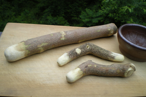 そして、とても硬い材は「すりこ木」にも。わが家でも、2年前の台風で倒木にのしかかられ真っ二つに折れてしまった山椒の樹を使い、すりこ木を手づくりしました。