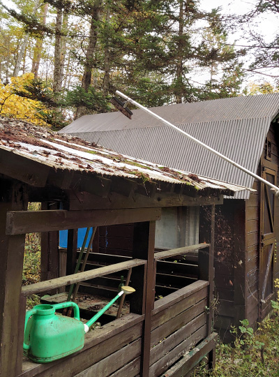 踏んで歩くには心地よい落ち葉ですが、屋根に積もった落ち葉は放置しておくと家の傷みの原因にも。雪が降り始める前に、それを取り除いておかなければなりません。母屋の屋根は急勾配になっていて落ち葉が積もることは少ないのですが、問題は素人で手作りした東屋の屋根。家人が腰を傷めている今年は、私がやるしかありません。高い脚立に登り長い柄をつけたほうきを持って行う落ち葉の掻き出しは、高所恐怖症の私にとってなかなか骨の折れる作業でした。