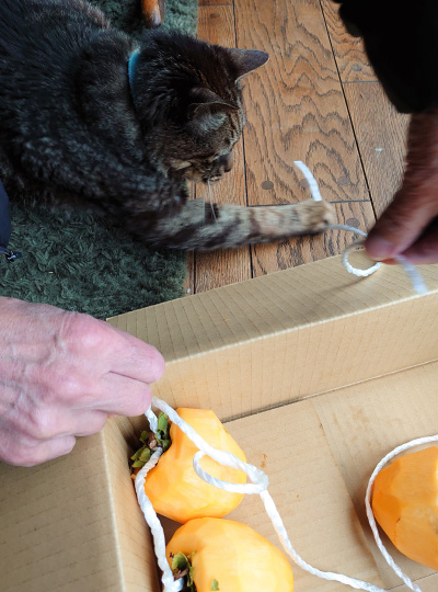 遊び仲間の犬が亡くなって暇を持て余している猫は、干し柿用のロープにじゃれて遊ぼうとします。