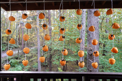 趣味で100種類以上の果樹を栽培している友人の話では、「カビや細菌の増殖防止には15℃以下の環境下での乾燥が必要」とのこと。温暖な岡山に在住するその友人は、冷蔵庫の中に除湿器を入れて乾燥させるといいます。その点、こちらは寒冷地。ただ干しっ放しの素人仕事ですから、寒くなるのを待ってはじめます。以前は毎年200個ほどは作っていましたが、今年は久しぶりのこともあり、わずか40個弱。それでも軒下の柿のすだれは、冬を迎える景色に少しだけ明るい色を添えてくれます。
