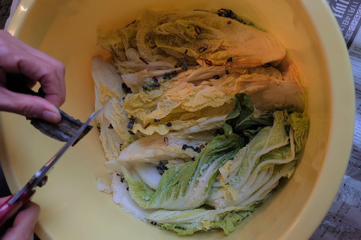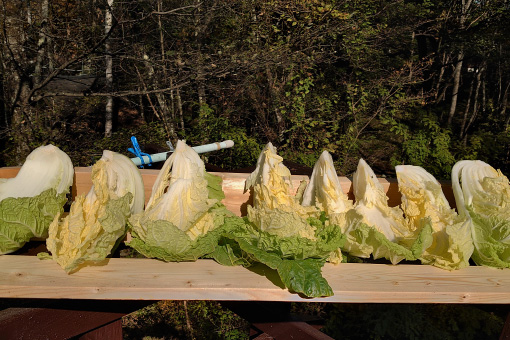 白菜も、半日程度干している間に葉っぱが凍ってしまったことが度々。今年はなんとか晴れ間をとらえて、凍らせずに干すことができました。白菜は寒くなるほどおいしくなるのですが、残念ながらわが家での白菜漬けは、12月初旬が限界。できるうちに、せっせと仕込んでおくつもりです。