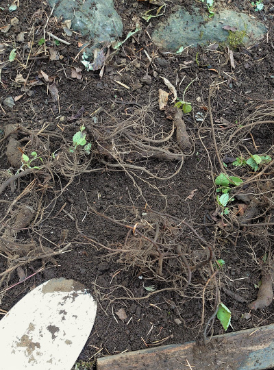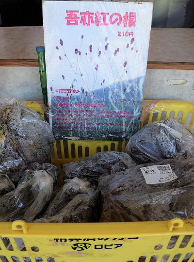 富士山の日(2月23日)に愛犬が旅立って、10ヵ月近く。温かい毛に触れることのできないこの冬は、寒さもひとしおに感じることでしょう。そして、彼が眠る庭の山桜の樹の下も、年が明けると雪に埋もれるはず。きっと寂しいだろうな、と気になっていたとき、道の駅で「吾亦紅(われもこう)」の根を見つけました。