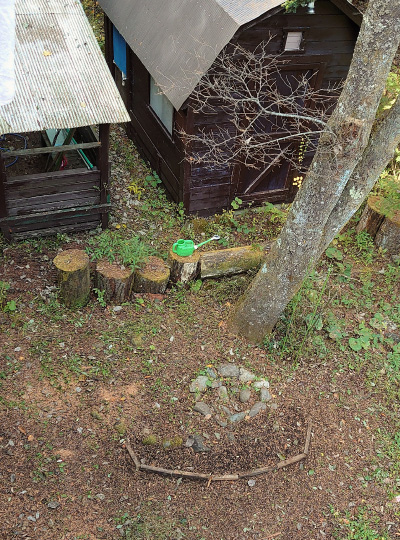 円形に石を積んだところが愛犬の眠る場所。その前方に吾亦紅を植えました。