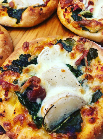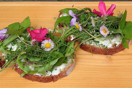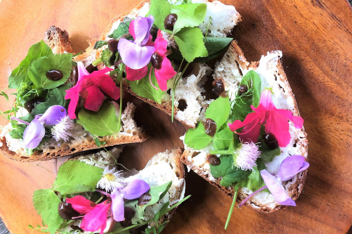 カンパーニュの上にのせられた野草は、ハルジオン、スズメノエンドウ、ミツバ、タンポポの葉、サツキ、フジの花