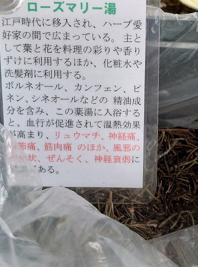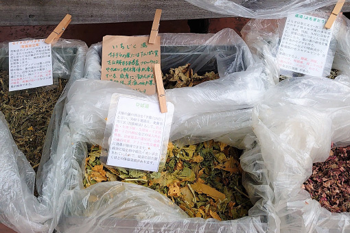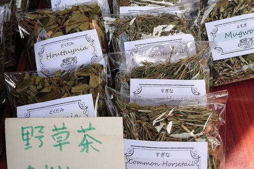 パラソル下のテーブルの半分以上を占めるのは、入浴用に乾燥させた植物たち。ヨモギやヒバ(大根の葉っぱ)、ドクダミ、セイタカアワダチソウといった野草だけでなく、「野草」のくくりには収まりきれないミカンの皮、桃の花、イチジクの葉、月桂樹、ヒノキ、ローズマリーなども並びます。いずれにも、それぞれの薬効や由来などが手書きされていて、読むだけで野草講座に参加している気分。