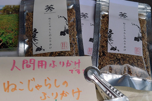 野草茶だけではありません。パラソルの下には、鶴岡さん手作りのものがいっぱい。「人間用のふりかけです」と注意書きのついた「ねこじゃらしのふりかけ」もありました。そう、猫や犬がじゃれて遊ぶ、あのネコジャラシ(エノコログサ)です。聞けば、エノコログサはアワの原種で、おいしく食べられるのだとか。「野草の風味をシンプルに味わってほしいから」、同じく野草のハコベと海苔少々を加え、塩で味つけしただけ。講座で語られるはずのお話を独り占めして聞くなんて、なんだか申し訳ないくらいの贅沢な時間でした。