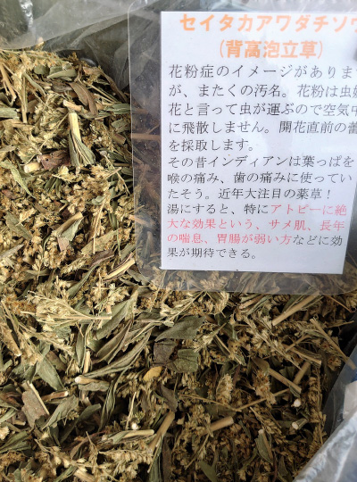 その昔インディアンは、セイタカアワダチソウの葉っぱを喉の痛みや歯の痛みに使っていたとか。「在来種を駆逐して日本にはびこる外来種の雑草」という悪者っぽいイメージが強かっただけに、ちょっと意外でした。