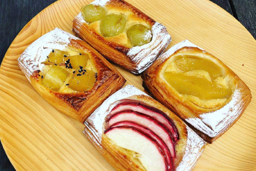 さて、会場になったパン屋さん「ベーカリールーブル」も、地域に根差したとても魅力的なお店でした。基本のパン生地を大事にしながら、できるだけ地元の食材を使い、丁寧にひとつひとつ手作り。「店のパンを通して、山梨のおいしい食と文化を伝えたい」と言うように、国産小麦や県産の食材を使い、地域の文化の香りも取り入れた香り高いパンたちが並びます。なにしろ山梨はフルーツ王国ですから、旬の果物をのせたフルーツデニッシュなどはお手のもの。さらに南アルプス産の小麦を使ったり、県内の身延(みのぶ)町の竹炭組合がつくっている竹炭を生地に練りこんだり、県内の養殖場でニジマスとキングサーモンをかけ合わせて生まれた魚「富士の介」をサンドイッチにはさんだり、総菜パンのトッピングに地元の野菜を使ったり、はたまた近くのレストランの人気メニューであるハンバーグをはさんだり…地域食材のオンパレード。パンをのせるトレーも南アルプス産のヒノキ材という徹底ぶりです。