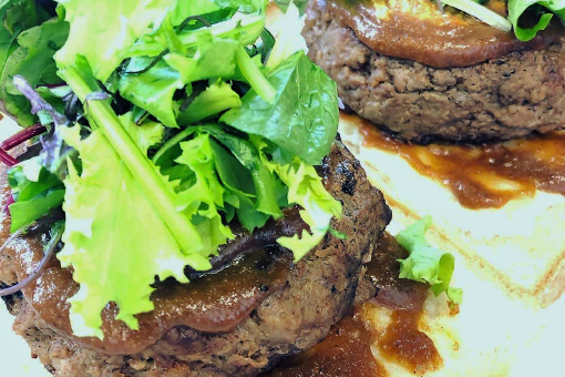 そして芦沢さんが持ってきてくれたのは、この日のイベントで出す予定だった春の野草のタルティーヌです。県産小麦とライ麦を使ったこだわりのカンパーニュにクリームチーズ(マスカルポーネ)を塗り、春の野草をのせて、その上に鶴岡さん特製の「スモモと黒ニンニクのジャム」をソース代わりにかけたもの。パンというキャンバスの上で、野の花が可憐に咲いているような美しさです。食べてしまうのがもったいないほどですが、野草の爽やかな香りと花の独特な歯ざわりが楽しい。チーズの天然の甘み、甘酸っぱいソースの味と相まって、口の中を草原の風が吹き抜けていくような清々しさです。