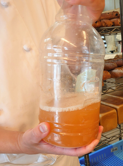 パン生地作りには、一般的なパン酵母だけでなく、いくつかの自家培養酵母種を使っています。そのひとつは、なんと八重桜からとったという酵母種。芦沢さんは店の外まで出て近くの山を指さし、「あそこの山の上の八重桜からとった酵母を自家培養している」と熱を込めて説明してくれました。酵母種の瓶のフタを開けると、いきなりシュワッという音がして発泡。辺りに良い香りが漂い、素人目にも酵母が元気に生きているのがわかります。