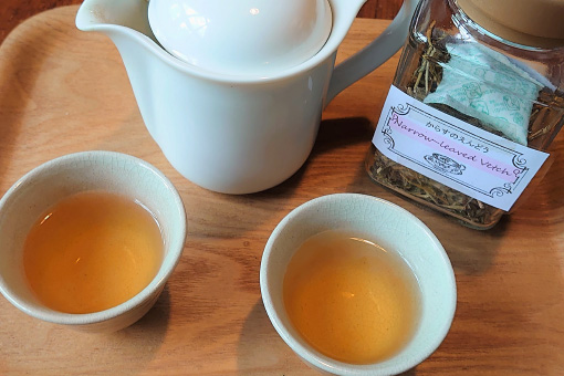 鶴岡さんと話している間にも、ふらりと立ち寄ったお客さんが野草茶のことをいろいろと訊ねてきます。「カラスノエンドウのお茶は、黒豆茶に近い風味。汗を出したいときや、呼吸を深くしたい人におススメ」「ナズナ茶はお出汁のような味わいで、お塩を加えるとスープとして飲めるので、私は"野草コンソメ"と呼んでいます」などなど。