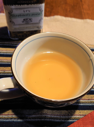 家に帰って早速、「野草茶」で一服。カラスノエンドウ茶(写真上)はクセのない味わいで、口の中を日向水(ひなたみず)が通っていくような、やさしいのど越しでした。そしてナズナ茶(写真下)は、鶴岡さんに聞いた通り、お茶というよりお出汁のような旨みがあり、和風コンソメといった感じ。塩コショウ少々を加えて、その日の夕食のスープ代わりになりました。