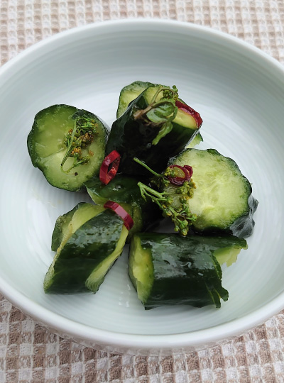 なんだか無性に「自然」に触れたくなって、翌日は庭の花山椒を摘みました。「花は実の素」と思うから、これまでは摘まずに樹上に残してきたのですが、ほんの数日間しか味わえない稀少なものと聞き、今年は思い切って摘んでみました。とはいえ、佃煮にするほど大量に摘むことはやっぱりできなくて、ほんの少しだけ。キュウリの和え物や山芋に載せて季節の香りを楽しみました。