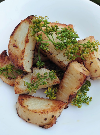 ゴマ油で軽くソテーした山芋に花山椒を添えて。山芋のほっくりした甘みには、香り高いけどやさしい辛みの花山椒がよく合います。