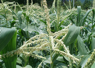 イネに似た、トウモロコシの雄花。雌花は下の方にあり、受粉したら実になります。